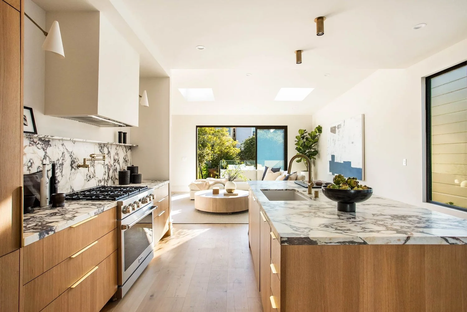 Modern kitchen with marble countertops, wooden cabinets, and a view of a living room with large windows and outdoor scenery.