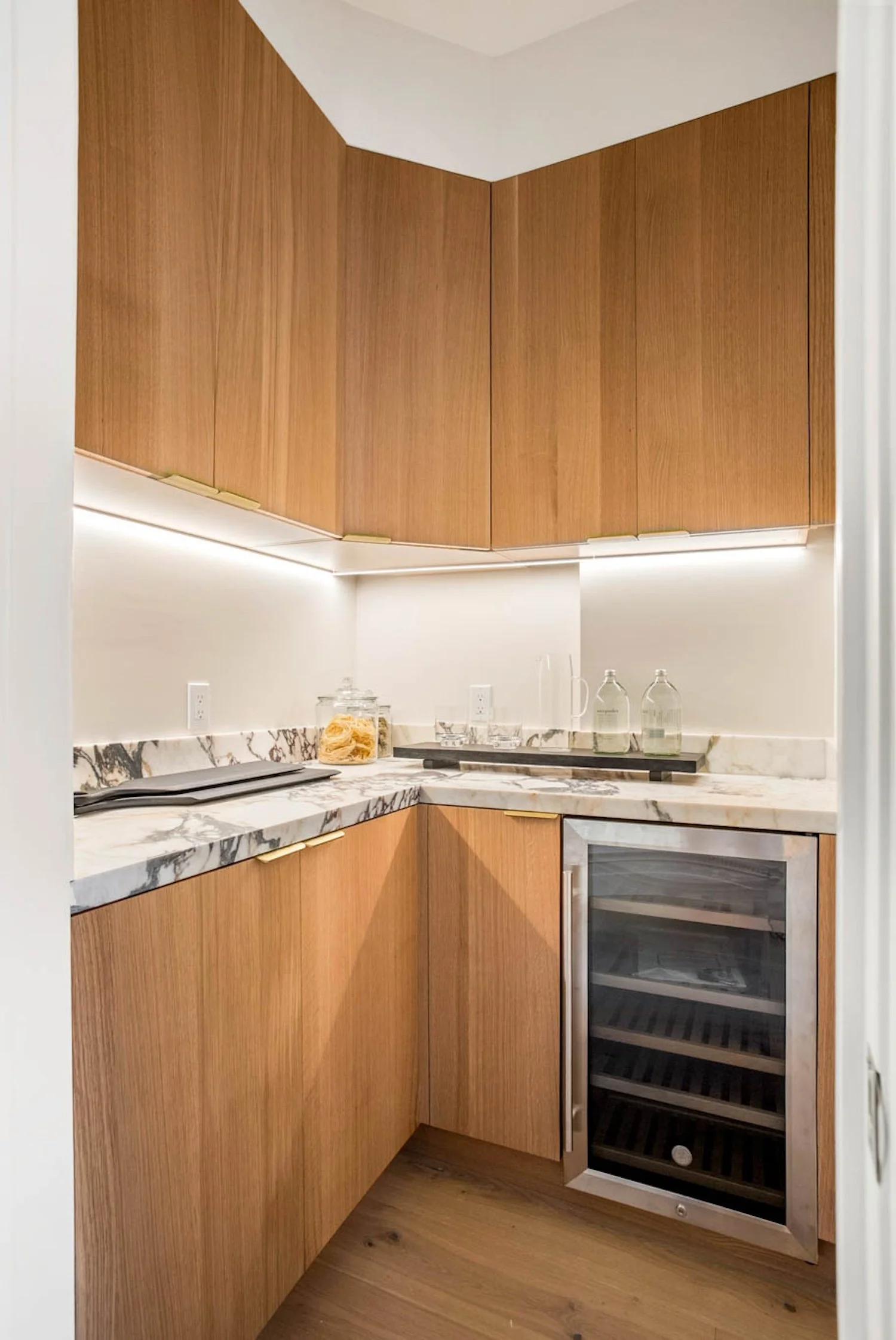 A modern kitchen corner with wooden cabinets, a marble countertop, and a built-in wine cooler. There are glass bottles, a pitcher, and jars with pasta on the counter, with under-cabinet lighting. View fullsize